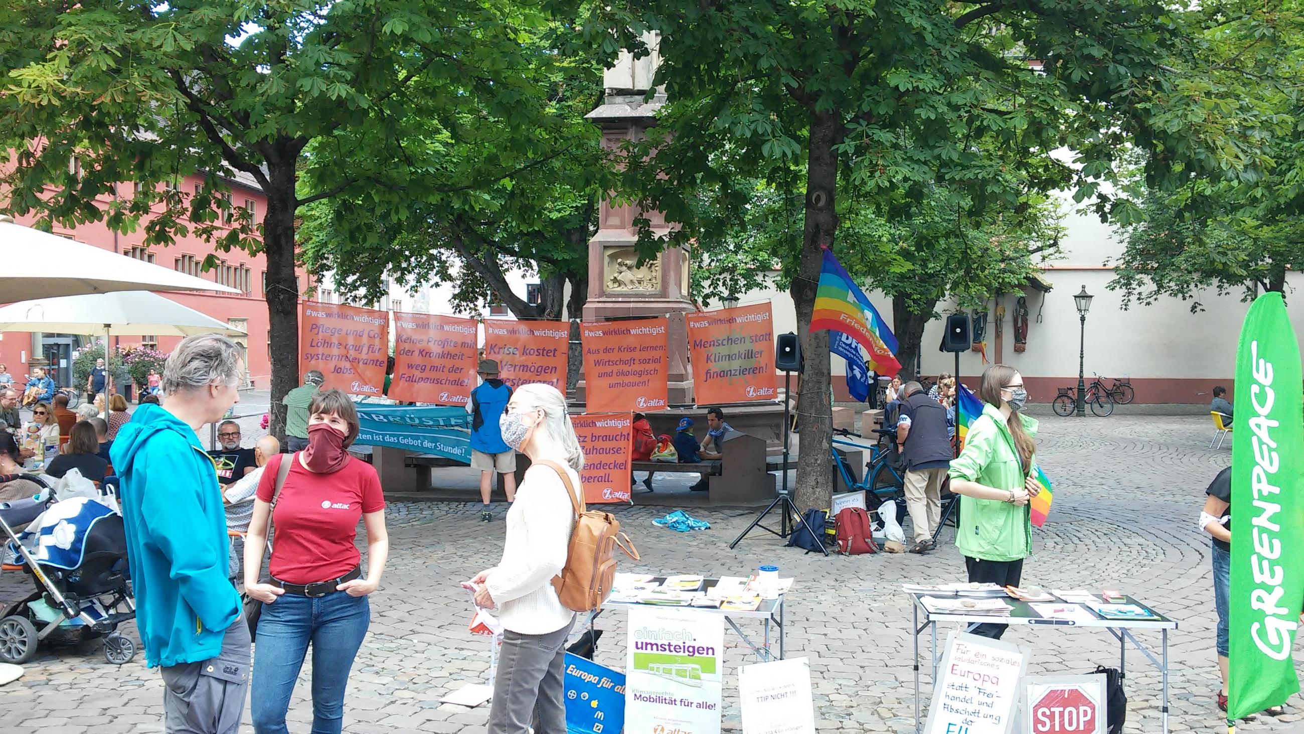 Die Aktion am Samstag, den 30.05.20, fand auf dem Rathausplatz mit einem bunten Strauss an Initiativen statt. Mit von der Partie waren: Greenpeace Freiburg, Friedensforum, Seebrücke, Fuß- und Radentscheid und attac Freiburg. Die Attrappe einer "Atombombe" des Friedensforums sowie Banner, Plakate, bunte Fahnen und Kreidespray - Symbole sollten die Aufmerksamkeit der Passant*innen auf sich ziehen.