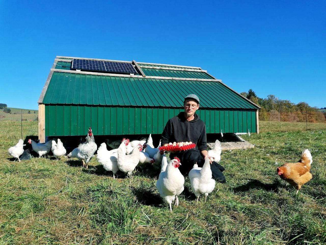 Neben Fleisch und Saft gibt’s schließlich noch Eier von den Bio-Weidehühnern. Die Hühner wohnen in einem mobilen Stall. Dieser Stall wird regelmäßig auf eine andere Fläche gestellt. Das hat unter anderem die Vorteile, dass der Dünger sich auf den Flächen verteilt, der Boden nicht zu stark beansprucht wird und die Hühner auf der frischen Wiese Regenwürmer finden können. Es handelt sich bei den Hühnern um Zweinutzungshühner. Das bedeutet, es werden nicht nur die weiblichen Hühner als Legehennen aufgezogen. Auch die Männlichen werden aufgezogen und deren Fleisch wird später als Fleisch vom Bio-Weidehahn vermarktet.
