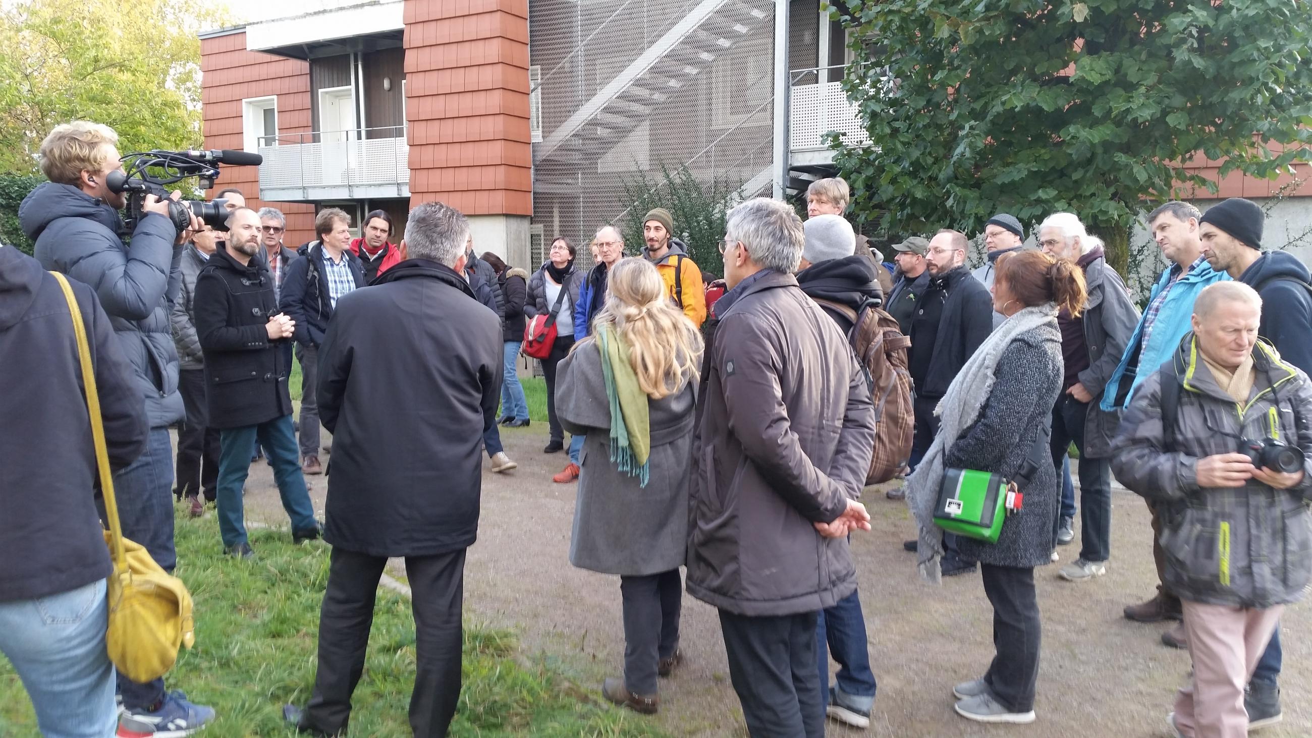 So begrüßt sinngemäß Jean-Marc Gremmel die Freiburger Exkursionsgruppe aus Architekt*innen, Zimmer*innen, Strohballenbauer*innen, Baugruppen, Aktivist*innen und Interessierten an einem November-Donnerstag in der französischen Kleinstadt St. Dié. Gremmel ist Vize Präsident des Wohnungsbauträgers Le Toit Vosgien und zusammen mit dem Direktor Patrick Schmidt Gastgeber des deutschen Besuchs. Die Inspiration, von der Gremmel spricht, sind zwei Passivhäuser, die das Unternehmen 2014 erbaut hat und die zusammen 26 Sozialwohnungen beherbergen. Die Gebäude sind aus einer Massivholzkonstruktion gedämmt mit Strohballen, das größere der beiden ist mit 7 Stockwerken der höchste Strohballenbau Europas. Le Toit Vosgien macht damit vor, wie ökologisch und sozial verträglich gebaut werden kann.